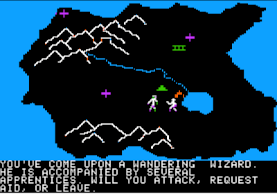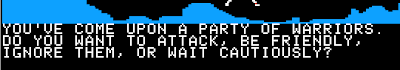 - 4 points for encounters. We have to give the game due credit here. There's not much else like it in the era, with random merchants and bands of warriors showing up, and the player's disposition towards them tied to an "alignment" meter.
