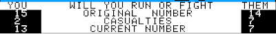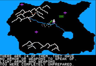 The opening section is rendered difficult by a few regrettable programming choices. Combat, while sticking to the basic mechanic of Wilderness Campaign, actually provides less feedback. Enemies "level" with the party in lockstep, so you can never really get a major advantage over them. If the party size increases from 10 to 20, the enemies increase from around 10 to around 20. As the party builds experience, the enemies get tougher. As the party buys better equipment, the enemies are better equipped. There's a random number roll that affects combat, but it's worth so little compared to the equipment and experience score that every battle is essentially a foregone conclusion from the outset.