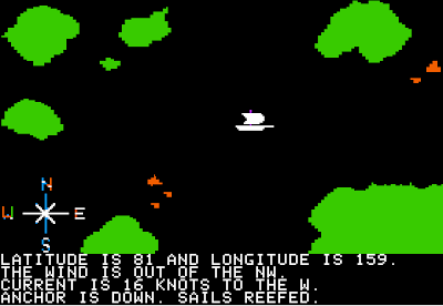 Once you purchase the boat, you're launched into the second phase of the game: sea navigation and combat. The interface changes dramatically, with commands for setting sails, dropping anchor, landing on various islands, firing the cannon, and hailing ships.