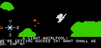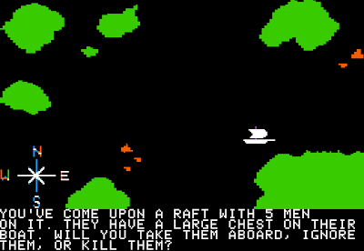 Special problems and encounters during this section include sea monsters, pirates, merchant ships, ships full of mercenaries who will join you, hapless men adrift on rafts who are alternately truly helpless and members of a pirate gang pulling a ruse, whirlpools, scurvy (you need to have stocked up on fruit), fog, and various calamities that damage your sails and require you to have brought replacement sails.