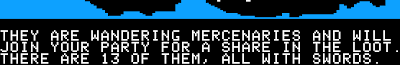 There are several random encounters in the wilderness, including wandering bands of fighters who join the group, wandering merchants, wizards who alternately help by providing a magic item or get annoyed and attack, bandits posing as friendly warriors, and a variety of monsters. As in Wilderness Campaign, "exploring" dungeons is all text-based from the main screen, and they usually contain some variety of traps, monsters, and either gold or a magic item at the end. Once you find the dungeon's treasure, it kicks you out, the door seals, and you cannot return.