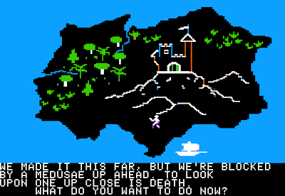 The endgame occurs on the far northwest island, but you can't maneuver freely around it like on the first island. There's really only one navigation command: (A)pproach the castle. The game gives you three random item-based encounters, and you have to dig through your pack to find, say, a mirror to defeat a medusa, a machete to chop through poisonous brambles, or a monkey--yes, a monkey--to unlock a door.