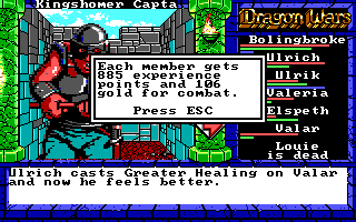 Combat in Dragon Wars has definitely improved, but I still don't love it. There are still a bit too many random combats (never mind what I said in the first posting; it got a little worse). In previous Interplay games, you could blow through random combats because you knew you could heal at the end of them and then wait for spell points to recharge. But in Dragon Wars, there's no recharging of spell points without using expensive (though admittedly plentiful) dragon stones, so you need to conserve magic, which means conserving hit points in combat itself. Yes, the "bandage" skill is free, but it doesn't heal everyone fully, so you need spell points if you want to keep everyone at top shape. Yes, there are magic-recharging pools, but I've only found three of them, all very close to the beginning of the game. Part of me wishes for Might & Magic's CTRL-A, which zips you through easy combats by selecting default actions for every character, but it would be irresponsible to use it in this game even if it existed.