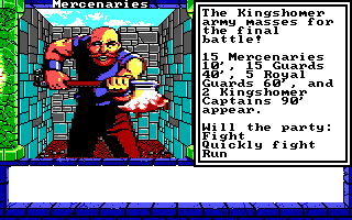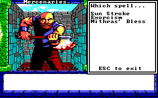 - I had everyone cast buffing spells during the first round except for my high mage, Elspeth. The 15 mercenaries weren't capable of much damage--maybe 1 or 2 points when they actually hit. Rather than fight them with melee weapons, I had them cast spells like "Luck" (+2 to defense for 1 character), "Mithras's Blessing" (+3 to defense for whole party), "Armor of Light" (+2 to armor class for 1 character), and "Scare" (+2 to the attack value for the party against one group). I took care of the mercenaries with two castings of "Poog's Vortex" from my high mage.