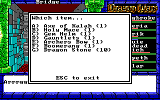 I hate games that do this. Which is a better weapon? The "Slicer," the fire sword, the lance sword, or the "Axe of Kalah." I have no idea. You have to watch the damage values and compare, I suppose. Certain weapons have special uses like casting spells, and I've found that some of them allow an attack at greater than a 10-foot range. But I wish it would just tell me how much damage each weapon does.