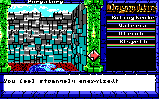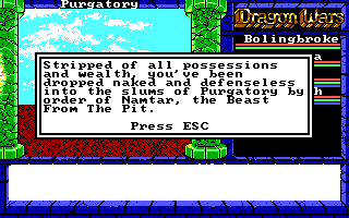I rather like the setup of the game, with the party tossed into Purgatory with no weapons, armor, or gold, facing hostile denizens, and trying to find a way out. In difficulty, it reminds me of the opening stages of Might & Magic. There's something thrilling about progressing from bare fists to your first short sword that simply isn't present when you're progressing from a long sword +4 to a long sword +5.