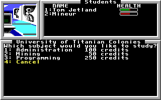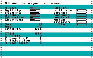 You can't control anything about the beginning statistics and skills of the characters you recruit, though you can just keep searching for recruits until you find one who has the stats you want. And you can assign their names. My new party leader is a 42-year-old ex cop named Gideon with skills in handguns, rifles, melee fighting, cudgels, and battle armor. He's strong in agility and stamina, though a little weak in might. In due course, I supplemented him with Richter, an ex-marine with skills in automatic weapons, melee combat, and rifles; Melina, a woman with skills in administration and "street knowledge"; and Cohaagen, an ex-miner with skills in gambling and mining. I wanted to start with someone with medical or programming skills, but I wasn't able to find someone at the outset.