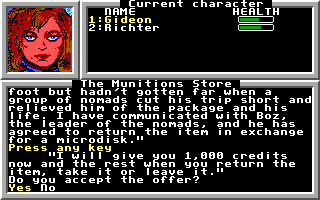 Several quests become available immediately in Primus. Someone has broken into the university and stolen a "specimen" and the police are willing to pay 20,000 credits for anyone who can identify the culprits. An escaped convict named Phelos Fletcher has fled Primus to the surface. Cybil Graves, the owner of a munitions shop, is willing to pay 5,000 credits for me to deliver a "micro disk" to the leader of the Nomads and bring back a package. She gave me 1,000 up front, which helped me stock up on weapons. Computer terminals have other "classifieds" from other cities, but it costs at least 5,000 to get out of Praxis.