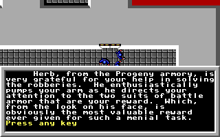 The "personal development institute" where you can train up your stamina reminds me of the gym and aerobics room in Sentinel Worlds I. I wonder if you'll like this game any more than that one. I know you've finished the game by now, so I'll keep reading...