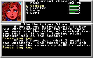 Much later, I found Cybil in an armor shop in Parallax, trying to buy armor for her Nomad friends. I got annoyed with the game in this section. There was a scripted set of screens in which Cybil offered me $4,000 to let her go and I weighed the offer in comparison to her $3,000 bounty. See what the screen says: