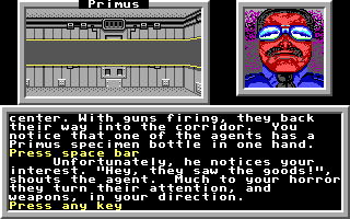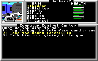 I went to the Primus office, and I had three choices: try to buy the plans, take them forcefully, or talk him into giving it to me. I suspect the first option would have worked with more administration skill and the third with more charisma, but I didn't have either, so I just robbed the guy. It got me wanted by the police, but I hacked a computer terminal and removed the bounty. When I returned the card to the SysOp in Progeny, he gave me a "prototype terminal," but I'm not sure what that did for me. Perhaps it would have allowed me to hack stuff if my hacking skill wasn't already so high.