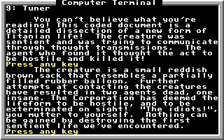 - A bunch of classified documents that suggest intelligent alien life forms have attacked the city of Procenium and have infiltrated the mines; hence, the lost of contact with the city and the announced shut-down of the mines. This attack might have been provoked by an agent's killing of one of the creatures. The creature itself is reported to be a "small reddish-brown sack that resembles a partially-filled rubber balloon."