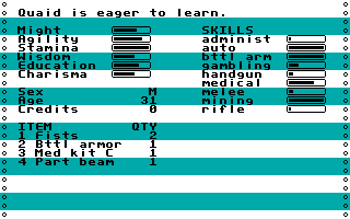 Secondly, the system is definitely Traveller. I think I yammered about it for a while back with Star Command; the most obvious reason is Education as a major statistic, plus your health being the combination of the 3 physical statistics.