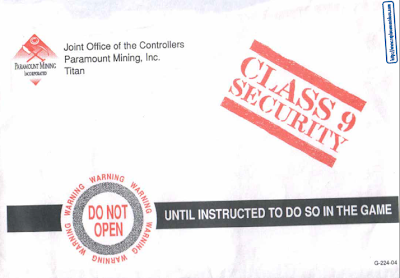 2) There's some documentation that comes with the game in a "sealed envelope" with instructions not to open it until instructed in the game. I never got such instructions. The documents seem to be what the characters would have seen in the paragraph starting with "With no distractions" above, I guess it tries to fuse the plot conflicts I describe. The destruction of Proscenium is presented as a different problem than the attacks on other cities, caused by killing and dissecting the intelligent aliens. The package includes a letter from the president of Paramount Mining condemning the scientists as "idiots" and ordering the abandonment of Titan and the destruction of all evidence. The president acknowledges that the civilians will all be slaughtered but says there's no way to evacuate them all.