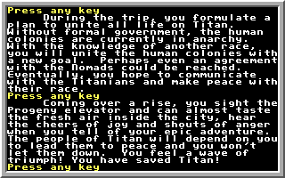 Coming over a rise, you sight the Progeny elevator and can almost taste the fresh air inside the city, hear the cheers of joy and shouts of anger when you tell of your epic adventure. [Do we have to imagine all of this? Wouldn't a good game actually show such an ending?] The people of Titan will depend on you to lead them to peace and you won't let them down. [Extremely deluded. We're a bunch of mercenaries and ex-military. What qualifies us to be political leaders? And why wouldn't the controllers return the moment they hear the threat is over?] You feel a wave of triumph! You have saved Titan!