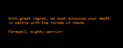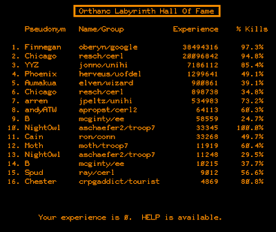 The Hall of Fame is a huge part of the game's addictive nature. The gamble over whether to retire now at position x or re-enter the dungeon and try for position y is perhaps the game's most difficult decision. I imagine it was a lot of fun back in the 1970s, with hundreds of students playing the game, for everyone to jostle their way into the various positions, the experience point totals climbing higher and higher, until 180 days passed, everything reset, and the board was a free-for-all again. Just getting onto the board at all kept me occupied for over my six-hour minimum, long past the point when I'd experienced what the game had to offer.