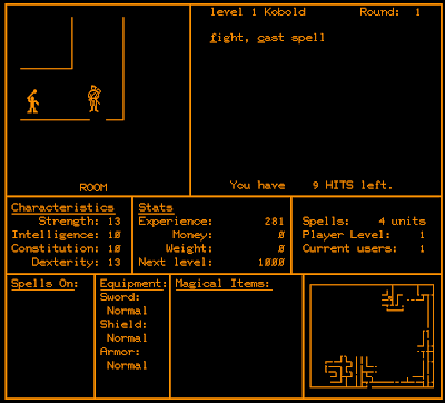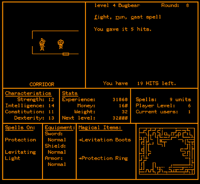 Survival depends on caution and, at the earliest character levels, a lot of luck. As you wander through the corridors with the WAXD keys, you'll encounter monsters of various types and levels, plenty of whom are capable of killing you in a single hit, and an equal number of whom get the first movement in combat. Combat options are limited to fight, cast a spell, and run, and "run" fails to appear a staggering amount of the time--almost always when you really need it. (Technically, the documentation says it works in corridors but not in rooms, but I don't see it as an option in plenty of things that look like corridors.)