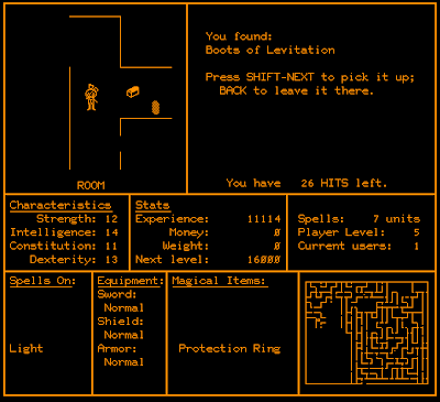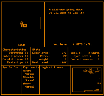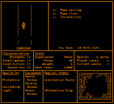 There are 10 dungeon levels, each 24 x 22 squares in size. The levels are fixed, but the game runs an automatic process to reconfigure them every 180 days, so truly dedicated players have to keep learning new layouts. Since there are no special encounters, NPCs, fixed treasures, or any other staples of later RPGs, there isn't much sense in exhaustively mapping each level. You basically just need to know how to get from one stairway to another. Secret doors, which are visible 1/6 of the time normally and all the time with a light spell active, are similarly useless, as there's nothing special behind them.