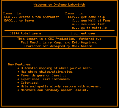 There's no multiplayer option in the game, but users can encounter each other in the dungeon and either chat or (after Level 1) fight. I didn't encounter any while I was playing. [In his e-mail to me, M. Resch notes that he removed the ability for players to fight on Level 1 because "higher-level players took to hanging around the entrance and killing lower-level players for the experience." Oddly, he says, "lots of people just talked to each other, even though you could do that anywhere on PLATO."]