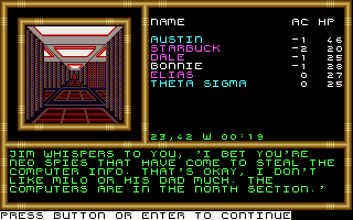 If Buck Rogers doesn't do a great job in this area, it does at least have an interesting approach to story-telling. The game doesn't spoon-feed the player the relevant plot points; the player, rather, must figure out what's going on from scattered encounters and clues. In my explorations, I found a group of hiding children and agreed to escort them to their escape vessel. It transpired that the genetic abominations were freed when one of the kids tried to help some rabbits escape (we eventually saved the bunnies). The kids, impressed with my bravery and not terribly loyal to RAM, fed me several bits of intelligence, such as the password to the base's computers and the location of RAM's secret base on Mars.