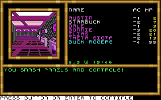 In my case, all of my characters were ready to level up and I was overloaded with equipment to sell. It really would have helped to train and increase everyone's "maneuver in zero-G" skill to improve my odds in combat, which had become increasingly more difficult. On the ship, I faced random and fixed battles with space pirates, most of whom threw grenades every round, some of them capable of stunning. Only Buck Rogers' presence in my party saved me from certain death. Armed with something called simply a "gun," he dished out more death than all of my party members with their laser pistols and rocket guns combined.