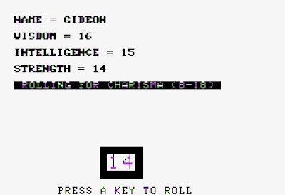 The game begins with a brief character creation process in which you set a name and roll stats for wisdom, intelligence, strength, and charisma. These stats have some effects on what wizards join you at the outset of the game, as well as combat on the first island, but otherwise they don't seem to play a big role. You also choose an alignment on a scale of -5 (chaotic) to 5 (lawful).