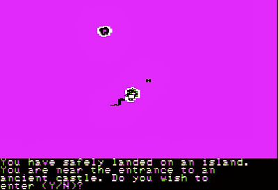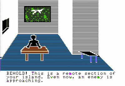 - 2 points for graphics, sound, and interface. The graphics are pretty primitive and the sound has that early-1980s piercing quality that's better left off. The keyboard shortcuts were easy to learn, so I didn't mind the interface except for the unnecessary step of having to type GO in front of a cardinal direction. To move east, you have to type G - E. Navigation across the islands would have been a lot easier with a key cluster.
