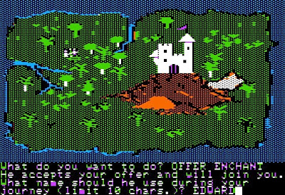 The main character is apparently only capable of leadership, not casting spells himself, so he has to recruit a party of up to six wizards from the island. This involves wandering around until they appear and then (O)ffering them one of the spells from the spellbook in exchange for their service. Starting spells are "Detect Aura" (determines a wizard's stats and alignment), "Magic Detect" (reveals the magical nature of objects), "Divination" (reveals hidden objects), "Enchant" (used to restore levitation plates--fuel, basically--on an airship), and "Panic Horn" (drives monsters crazy with rage and fear). Since you start with only these five spells, you can only recruit five wizards at the outset.
