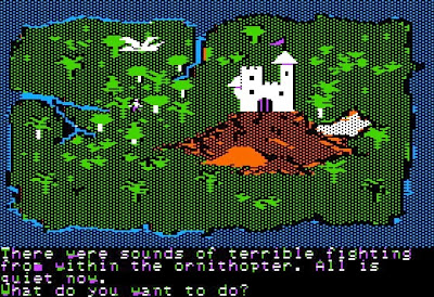 You begin on the island of Lapour, and the primary goals of the first section are to recruit enemy wizards and soldiers and to escape the island. In the castle, you find a spell book, a note from your desperate populace, and the magic orb that you must use at the endgame. (I wonder if any player ever made it all the way to the end having forgotten to pick up the orb at the beginning.) An oracle in the castle shows the player a vision of Atlantean airships (called "ornithopters") landing in the northwest part of the island and discharging monsters.