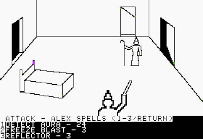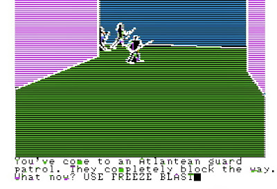 There are a total of nine "utility" spells (rope trick, levitation, teleport, part waters, penetration, spider climb, shrink, and flame sword) and six "combat" spells (invisibility, extinguish, reflector, sleep, freeze blast, and ball of fire) to find in the castles, and you may need any or all of them on Atlantis. Each castle only has four or five spell objects, and there's no guarantee that they won't be spells you already have. Therefore, the longest part of the game is exploring castle after castle to find every last spell. It particularly sucks when a wizard dies and you have to re-find his spells again (as well as recruit a new wizard), and I confess I used reloading fairly liberally.