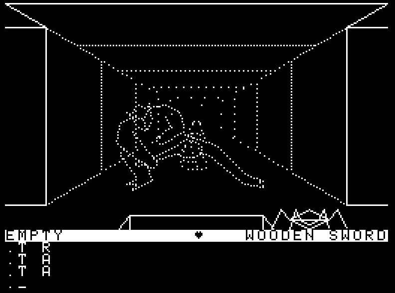 The game uses a text-based interface in which you type commands like MOVE, TURN, ATTACK, USE, and STOW. Most of the commands, other than movement, apply to the RIGHT or LEFT hands. So to get ready at the beginning of the game by taking your wooden sword from your backpack and putting it in your right hand, you'd use "PULL RIGHT WOODEN SWORD." To use this sword to then attack a creature, it's "ATTACK RIGHT." Fortunately, the game allows for some abbreviations. Each word need only have enough letters to distinguish a unique command or object, and you don't need to specify item descriptions if you only have one of them. So instead of "PULL RIGHT WOODEN SWORD," you can just type "P R SW." Just "M" is enough to execute forward movements, and "T R," "T L," and "T A" are enough to turn right, turn left, and turn around. These abbreviations are important because everything's happening in real time, and you don't want to be accidentally typing "ATTCK" when you go to attack a monster. Even with the abbreviations, I often get tripped up by the game not reading the SPACE bar in between commands. "AR" accomplishes nothing.