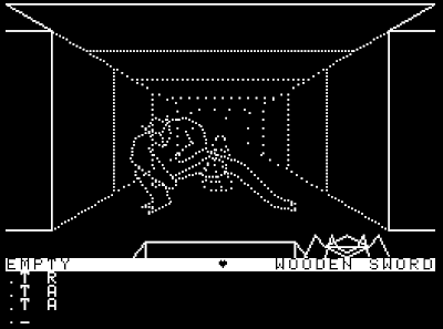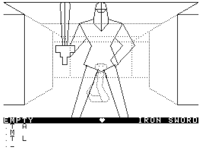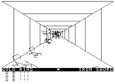 2. Hit and run tactics. This requires careful timing and fast typing. You wait for the enemy to land in your square and ATTACK just as he arrives. Then, before he can land his own blow, you MOVE ahead a square or two, wait, and repeat. It's difficult to get the timing right, and inevitably I screw it up if I have to do it more than six or seven times in a row. There are some monsters for which one screw-up means a reload. This tactic is also tough when there are a lot of enemies in the area.