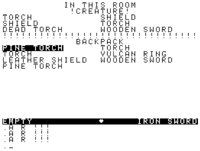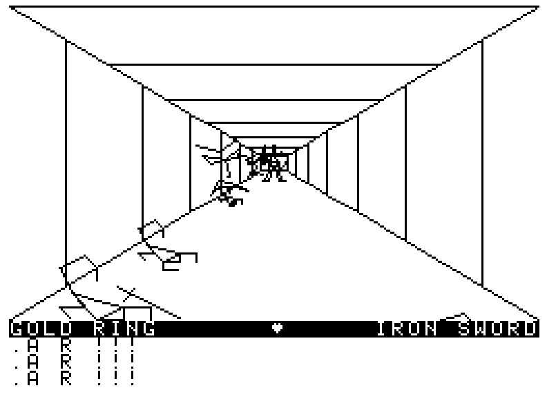 A downside to Dungeons of Daggorath is that the game is completely deterministic and rather unforgiving of mistakes. Each level has the same monsters, and same items, every time you play. You always find a Ring of Vulcan on the first level and a Ring of Rhime on the second. Each has exactly three charges. You need them for a "fake" wizard that appears on Level 3, so if you blow them attacking other creatures, you probably won't be able to progress in the game.