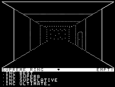 The rings are an odd game element. When you find them and REVEAL them, they have names like "Ring of Vulcan," "Ring of Rhime," and "Ring of Joule." Each has three charges, but before you can use their magical powers, you have to INCANT a magic word. The manual is vague about this process and doesn't give you the magic words; it was only through spoilers that I understood that INCANT FIRE activates the Ring of Vulcan and INCANT ICE turns on the Ring of Rhime. I mean, it makes sense given their names, once you know the theme, but it's still pretty tough for the novice player to figure out.