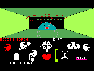 A couple of other mechanics make Daggorath memorable. First, you hear enemies when they're nearby. Each makes a unique sound: a staticky noise for vipers (I think it's supposed to simulate rattling), a kind-of thudding sounds for stone giants, a squeaking for spiders. These sounds grow louder as the creature gets closer to your position, a dynamic responsible for a lot of the game's tension. Second, the torch effects are fairly advanced for a game with wireframe graphics. There are three types of torches, each with different brightness levels, each illuminating a different number of squares ahead of you. Broken lines effectively denote partially-illuminated squares. "Dark" squares are denoted with lines of sparse dots. As the torch burns on, it loses its illumination power, and more of the lines become dotted. It's an impressive effect given the relative paucity of graphics in the first place.