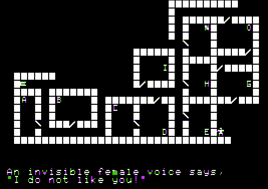There are some other innovative elements that aren't good or bad. Every few dozen moves, some random event occurs. A ghostly voice whispers "go away!" and teleports you somewhere random. A woman's voice whispers "I like you!" and increases your luck or "I don't like you!" and decreases it.