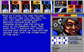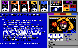 None of these quests involved anything more involved than landing on a planet and hunting around for the right nearby building. The backstory, which I described in the first post as "as intriguing as anything I can remember" turned into absolute nonsense--essentially just an easily-replaceable framing story for a game that's mostly about logistics and mechanics. Kiefer was hiding in a warehouse 10 steps from the opening screen, and the only thing stopping me from getting to him was a key? And why don't these agents just travel to each other? If Lenara knows where Kiefer is, why doesn't she just instruct Imperial forces to bomb it off the map? What does this group really need us for? Not to mention that the titular Zhodani don't show up in the game at all.