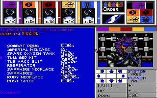 6. Equipment. Like many things in MegaTraveller, equipment is solid in concept, flawed in execution. There is a lot of stuff to buy and use, including weapons and armor, medkits, grenades, demolition charges, vacuum suits and helmets, spare oxygen tanks, electric torches and lanterns, and various quest items. There just isn't much reason to buy them.