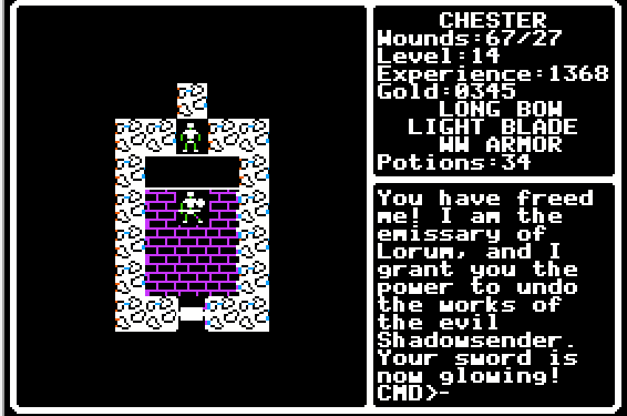 Combat consists of hitting (S)hoot if you see enemies from a distance and (F)ight if they're adjacent to you. There aren't many tactics except to take care that you don't blunder into foes. You can make some limited use of the terrain to make sure you don't get attacked by more than one foe at once. Foes that have missile weapons have no melee capability, so the best approach to them is to close the distance and start whacking. There is no magic in the game.