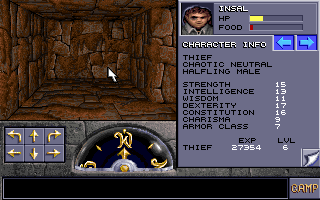 The game gives you the ability to create new characters or to import the victorious party from Eye of the Beholder. (And you can import the four characters you created or any of the NPCs in your party at game's end.) If you create your own, you have the usual AD&D races (human, elf, half-elf, dwarf, gnome, halfling), classes (fighter, ranger, paladin, mage, cleric, thief), attributes (strength, intelligence, wisdom, dexterity, constitution, charisma), and alignments. You have the usual race restrictions, such as only humans can be paladins and only non-humans can be multi-classed. The game uses AD&D second edition for its rules, so there aren't any level caps based on race. You choose a portrait from a small selection.