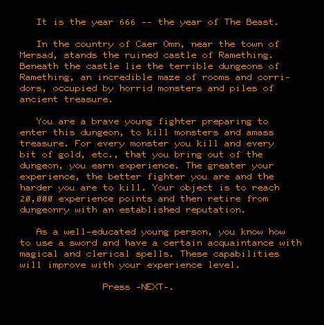The game begins by giving you 81 gold pieces and asking you to buy weapons and armor with it. There are some difficulties during this process. First, the lists of items give no prices; you don't find out how much an item costs until you select it. Second, when you select an item, you're asked how much you're willing to pay for it. The game acts like it's willing to haggle with you, but in fact if you type anything other than the asking price, you're told to make another offer. Third, if you can't afford the item on this screen, there's no way to back out of it. You're trapped in an endless loop of either making an offer that the shopkeeper rejects or making one that you can't pay.