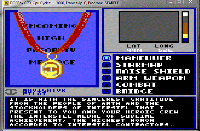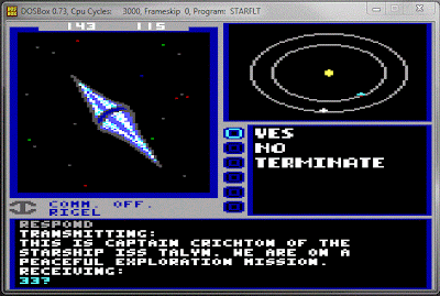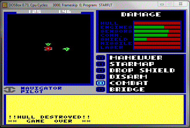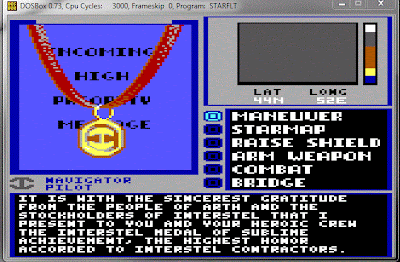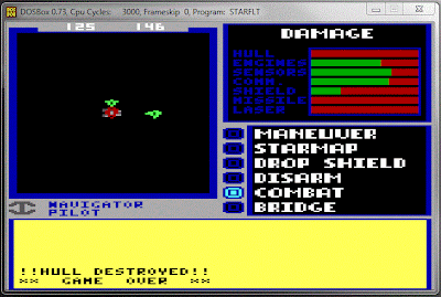9. Graphics, Sound, and Inputs. I had no complaints at all with the EGA graphics, but we're still in the "painful era" for sound, and I played the game with the sound turned off. The controls leave a little to be desired. You essentially have to use the number pad to scroll your way through the menus, which takes an annoyingly long time in combat (you're rushing to get from "communications" to "navigation" to put your shields up). It would have been very helpful to hotkey certain actions, as most of the keyboard is unused. Final score: 3.