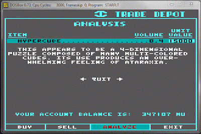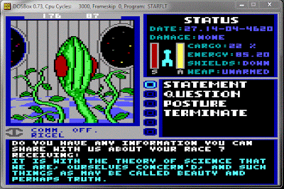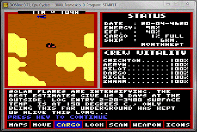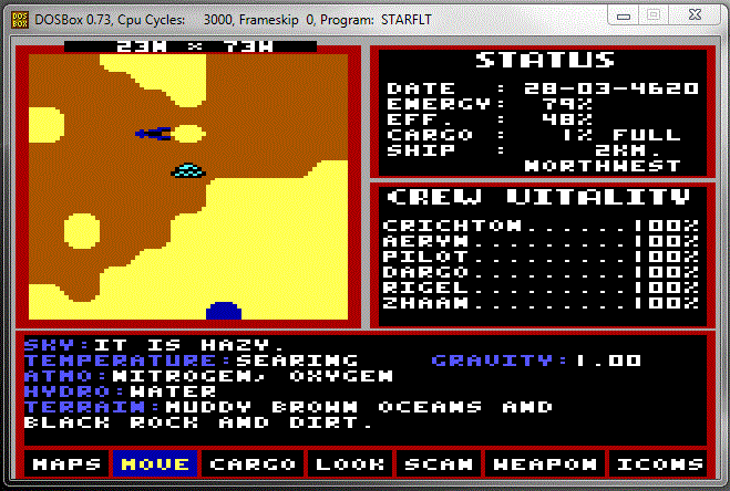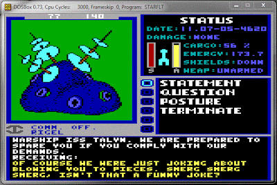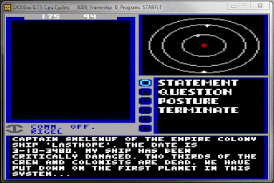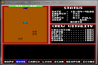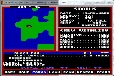 10. Gameplay. The gameplay is utterly open-ended, allowing you to explore the whole galaxy (to the limits of your fuel, anyway) right from the beginning. The pacing is good: I got addicted to it quickly and wouldn't had minded if it had lasted a few more hours, but it seemed to end at the right time. On the other hand, there's virtually no replayability except to mine new planets. [Later edit: reader Max points out that one replayability option is to choose Thrynn crewmembers and make friends with that race, getting different clues and reaching the endgame through a different route. Point taken, and final score increased.] On the question of difficulty, it's tough to evaluate. If you try to engage in combat, it's too hard, but other aspects are too easy. For instance, the manual makes a big deal about the horrible things that happen if you lose your Terrain Vehicle, run out of fuel and have to make a distress call, or recommend a bad planet for colonization, but really you'd have to be an idiot to do any of these things. Final score: 6.