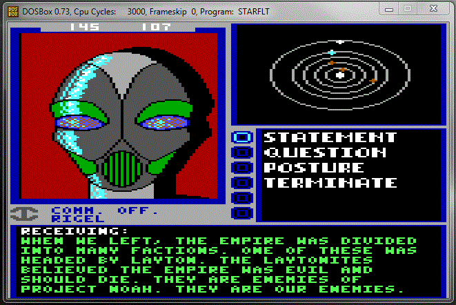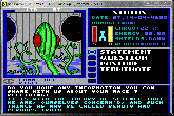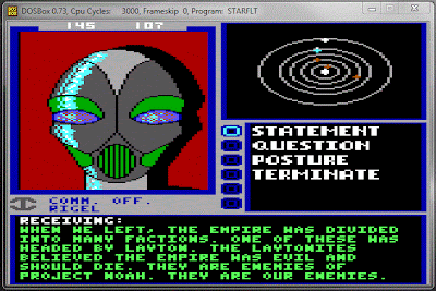 1. Game World. Absolutely top-notch. You have an entire galaxy to explore with a fascinating backstory that is sketched out in the manual but only fully revealed as you explore, find artifacts and messages, and talk to various races. The lore is unique and interesting, the final twist is amazing, and some mysteries persist even after you've won. Unlike almost every other game of the era, your actions measurably affect the game world and your relationships with the various alien races. I can't think of many games that do it better. Final score: 9.