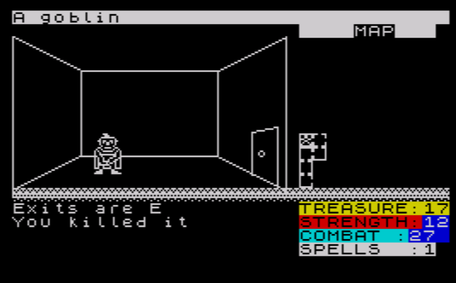 After an option to see some basic instructions, the game thrusts you into the southwest corner of a 10 x 10 dungeon with 12 strength and 12 combat ability. Your goal is to find the evil wizard, defeat him, take his key, and find the exit to the dungeon. I'm not sure how randomized everything is, but I found the wizard twice near the southeast corner and the exit twice near the northwest corner.
